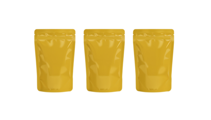 Golden packaging pouches standing aligned on a dark backdrop creating visual harmony