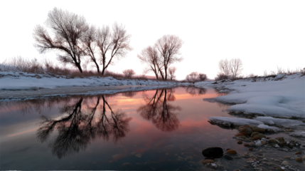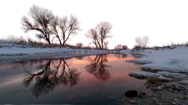 Serene Reflections: Witness the peaceful mirror image of barren trees, reflected in the still waters of a calm river. Embrace the harmony of nature.