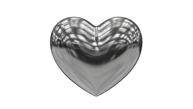 High gloss chrome metallic heart with liquid silver reflections and smooth curves, isolated subject, cut-out, background removal.