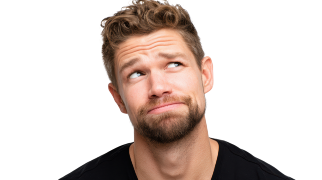 A young man with a thoughtful expression looking upwards, isolated on a white background.