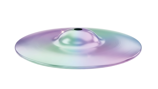 A shiny iridescent cymbal sits on a plain background with a subtle sheen.
