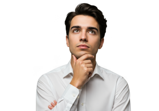 Young man with dark hair and thoughtful expression pondering deeply transparent background