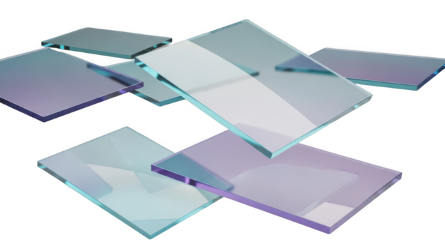Multiple thin optical filters or dichroic glass plates with reflective coatings isolated on transparent background