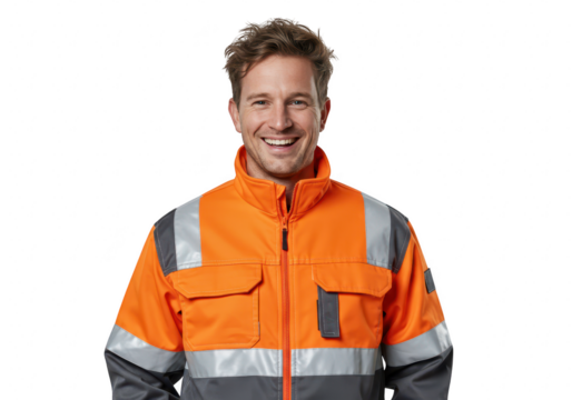 A smiling man wearing an orange hivis work jacket with reflective stripes, isolated on a transparent background