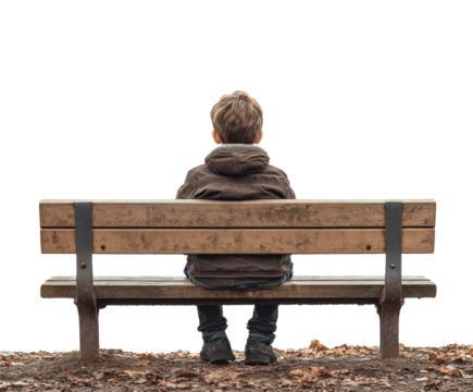 Child sitting alone on bench in urban park reflective mood isolated on transparent background