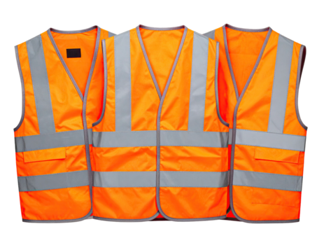 Bright orange safety vest with reflective stripes isolated on transparent background. High visibility orange safety vest with reflective strips for work isolated on white background.