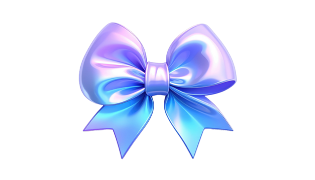 Iridescent light blue bow with white accents on black background, digitally rendered with reflective surfaces