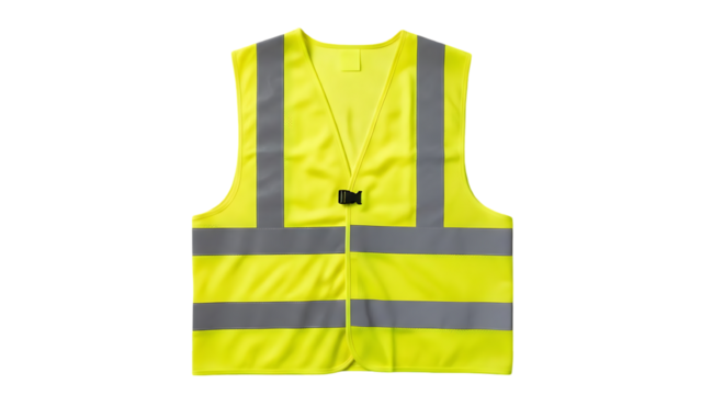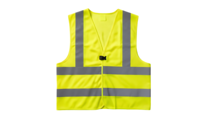 Bright yellow safety vest with reflective stripes on transparent background