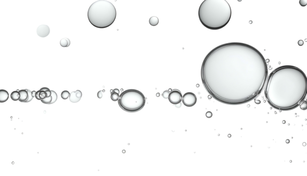 Shimmering, translucent spheres of varying sizes float on a stark black background
