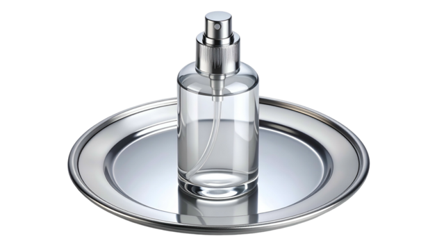 Clear spray bottle with silver metal top and stem, sitting on a round, polished metal plate