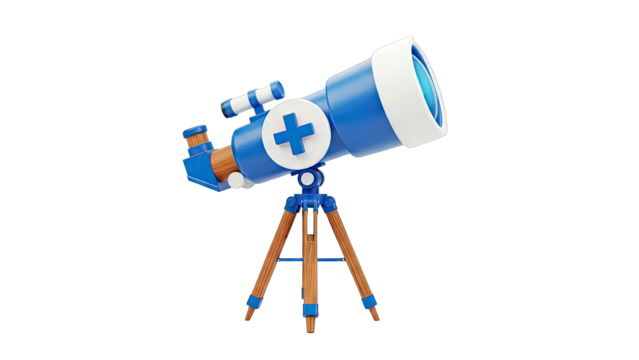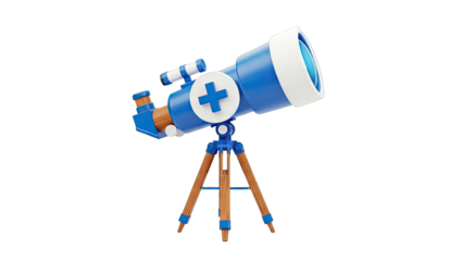 Stylized Blue Telescope with Cross Symbol on Tripod