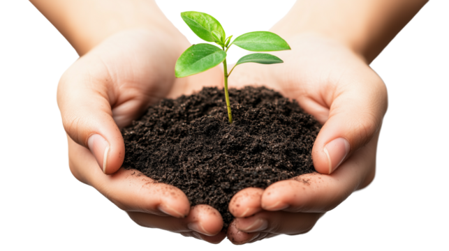 Hands Holding Soil with Green Seedling  Sustainable Growth Concept on Transparent Background