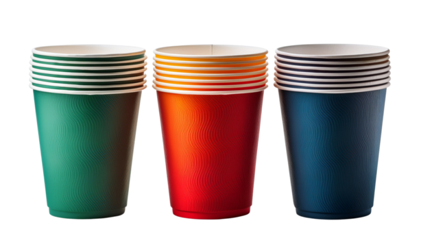 A stack of colorful coffee cups showcasing a gradient design in green, orange, and blue, arranged neatly.