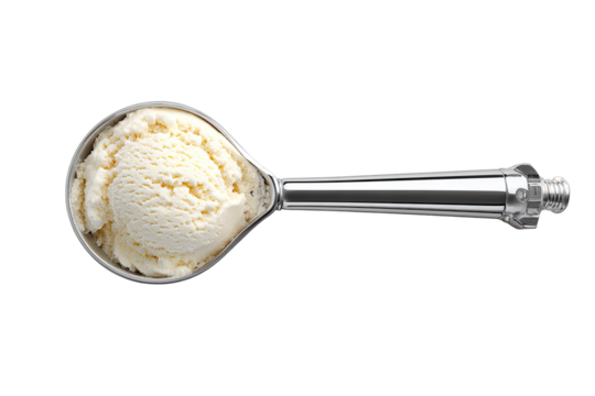 A scoop of vanilla ice cream in a metal scoop
