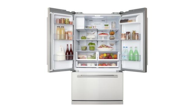 Open refrigerator with food cutout. Fridge with food on transparent background