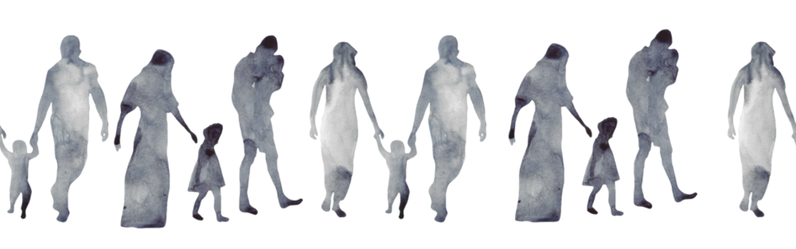 Watercolor border with silhouettes of people. Brush strokes in the form of blue silhouettes of people,Silhouette of family on white background.