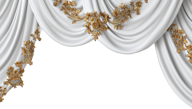 Ornate golden adornments accent cascading white drapery for a grand theatrical effect