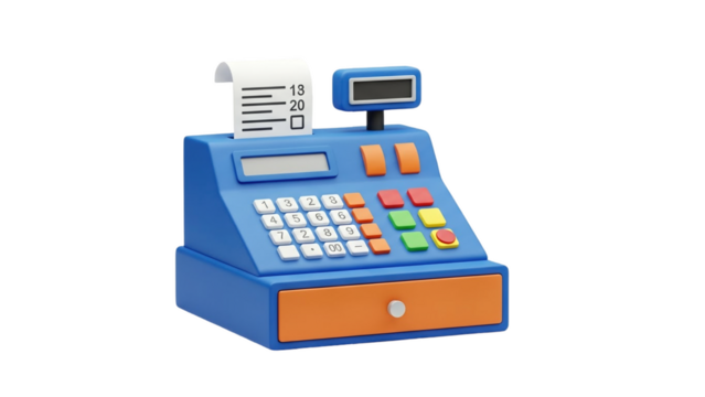 3D Retro blue cash register with receipt and orange drawer on transparent background