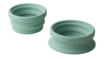 Teal food bowls have ribbed design and paw print. Ideal for product photography, catalog images, website banners, and social media.