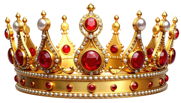A stunning, ornate illustration of a royal crown. Crafted from gold, it features radiant red gems and pearls, fit for a monarch