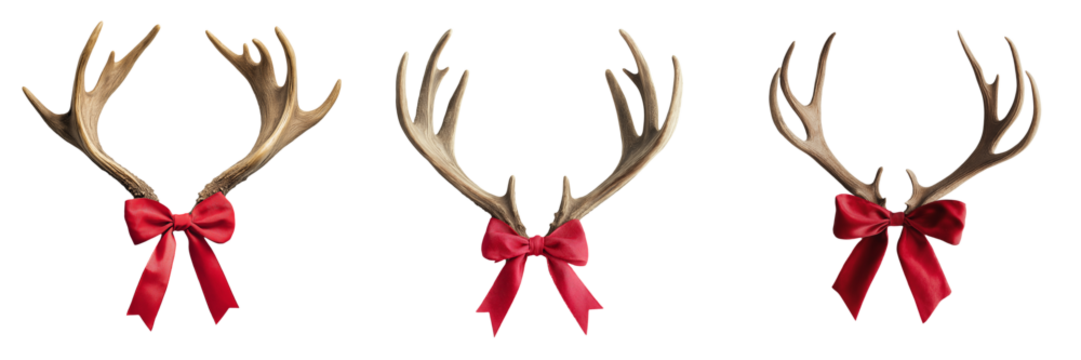 Isolated pair of reindeer antlers adorned with a festive red bow