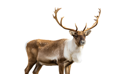 majestic reindeer displays imposing antlers in a photorealistic portrait, embodying strength and grace. Isolated on white background. Isolated On Transparent and White Background