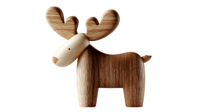 Cute wooden toy reindeer isolated on white background with a funny cartoon character look for Christmas fun