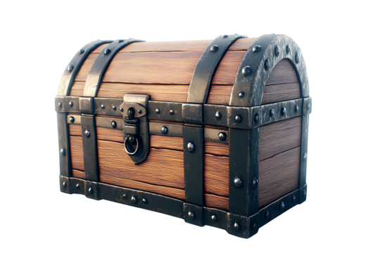 Three rustic wooden crates with metal corner reinforcements isolated on transparent background