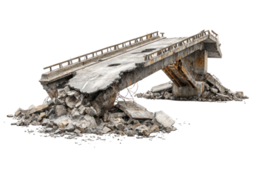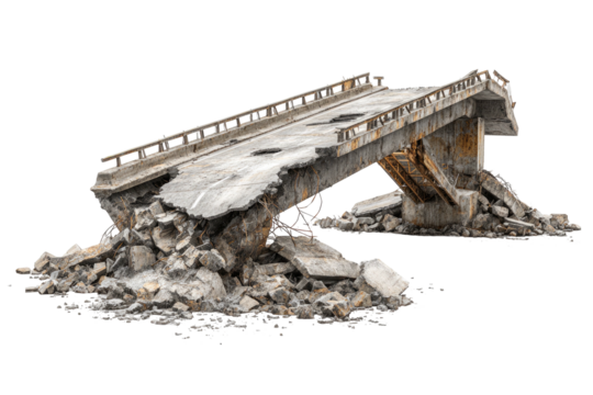 Severely damaged highway overpass, showing crumbled concrete and exposed steel reinforcement