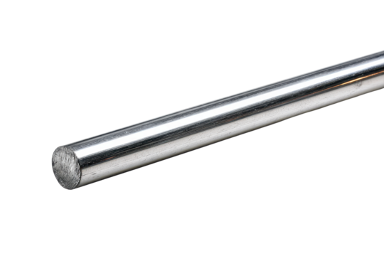 Thin straight metal rod stick with a reflective silver surface, cleanly finished ends, and sleek minimal hardware simplicity isolated on transparent background.