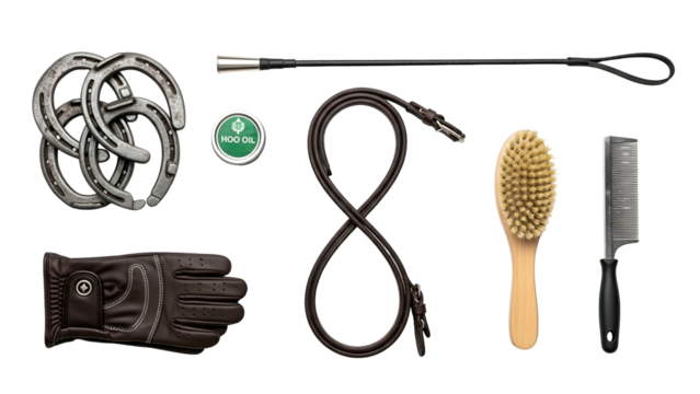 Equestrian Accessories Arranged On Black Background Featuring Horse Shoes Bridle Whip Gloves Brush And Comb Detail