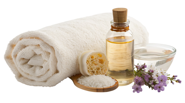 Relaxing spa essentials with towel candle and flowers for soothing relaxation wellness therapy