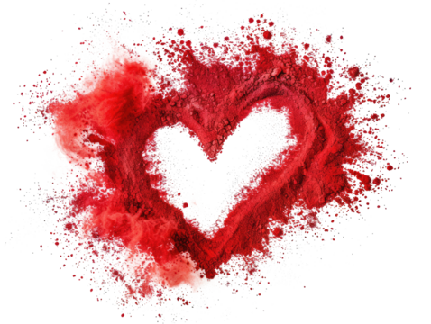 red color powder explosion in heart shape for love, romance and relationship isolated on white or transparent png