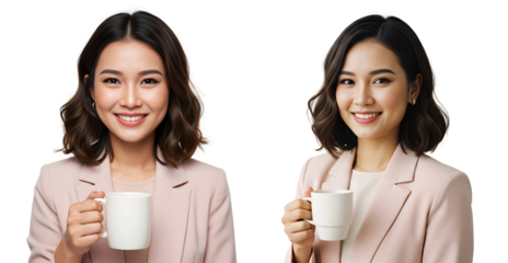 Two young women in pastel blazers hold white mugs, smiling confidently, isolated on transparent cutout background, cut out, png