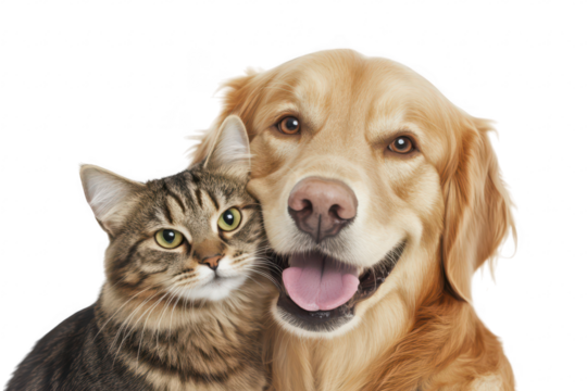 A joyful golden retriever and a playful tabby cat share a heartwarming moment together. their friendship against a clean. white background. perfect for pet-related content