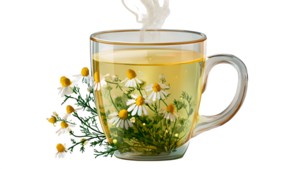 cup of chamomile tea with steam and herbs, relaxation symbol, transparent background