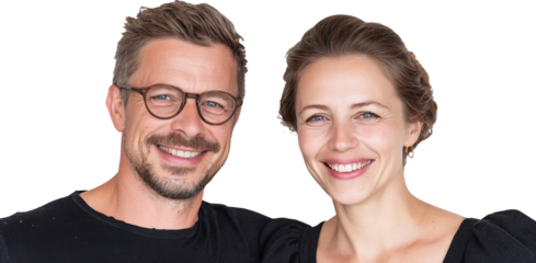 Smiling couple in casual wear exuding joy and warmth against a white background