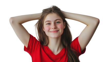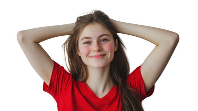 Smiling and content beautiful girl posing with her hands in pockets isolated on transparent white background