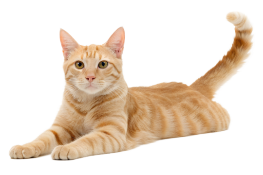 Charming ginger tabby cat with beautiful striped fur gracefully lounging on a clean white background, showcasing its relaxed posture and bright eyes. Ideal for pet and animal themes.