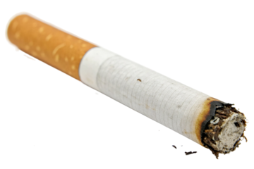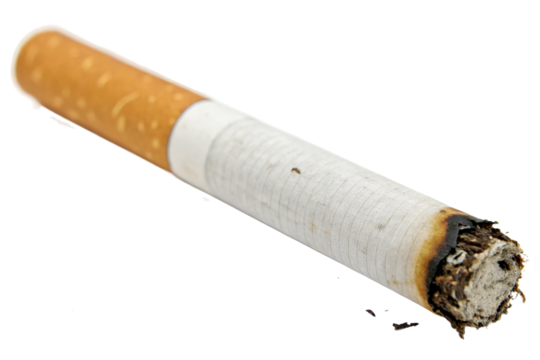 Burned cigarette lying on a surface with ash and smoke trails in a relaxed setting