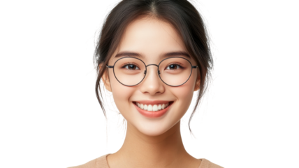 Smiling young woman with round glasses showcasing happiness and confidence in a bright setting