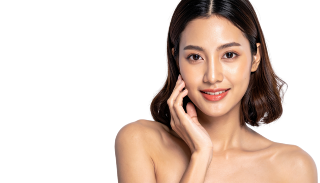 Beautiful Woman with Smooth Skin Touching Face and Smiling Softly