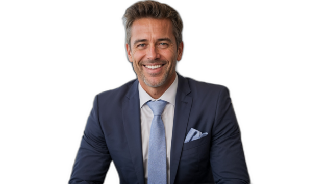 透明な背景に不動産CEOが笑顔を見せる、成功とリーダーシップの瞬間。生成AI