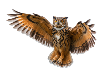 Majestic eurasian eagle owl with spread wings isolated transparent background