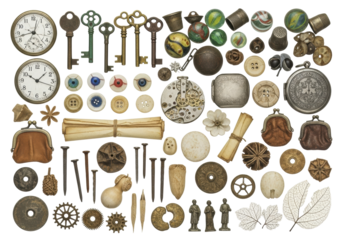 Macro flat lay of diverse salvaged antique artifacts: cracked watch, oxidized keys, glass marbles, thimbles, gears, parchment, on transparent studio background, concept of historical relics and