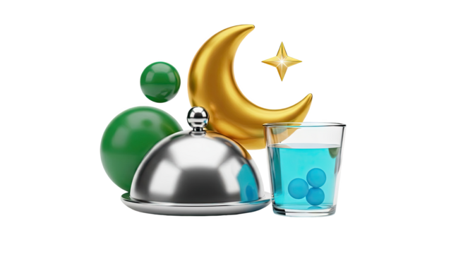 Ramadan Iftar Concept with Crescent Moon, Star, Food Cloche, and Drink