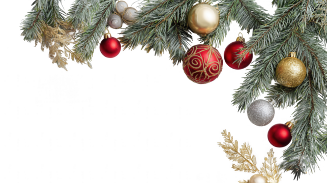 festive christmas decorations with pine branches and red, gold, and silver ornaments, jpeg, png, transparent