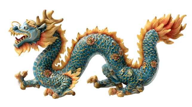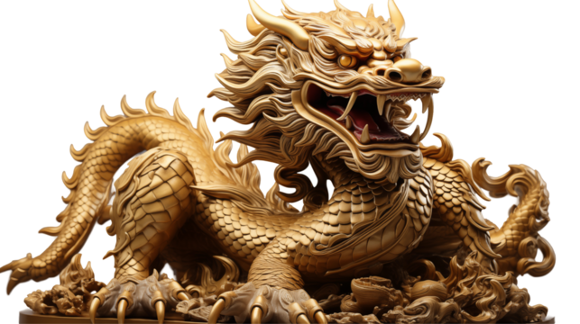 Golden Dragon Statue Ancient Chinese Art, Detailed Mythical Sculpture Symbolizing Power, isolated on transparent background.
