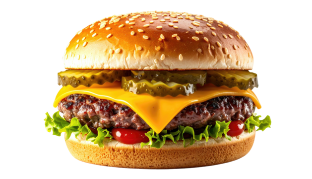 Sesame bun burger with cheese, pickles, tomato, and lettuce