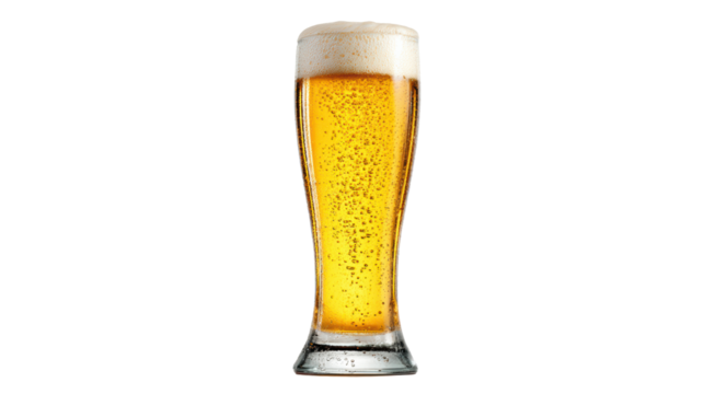 Refreshing beer served in a tall glass, featuring golden liquid and foamy head on a white isolated background.